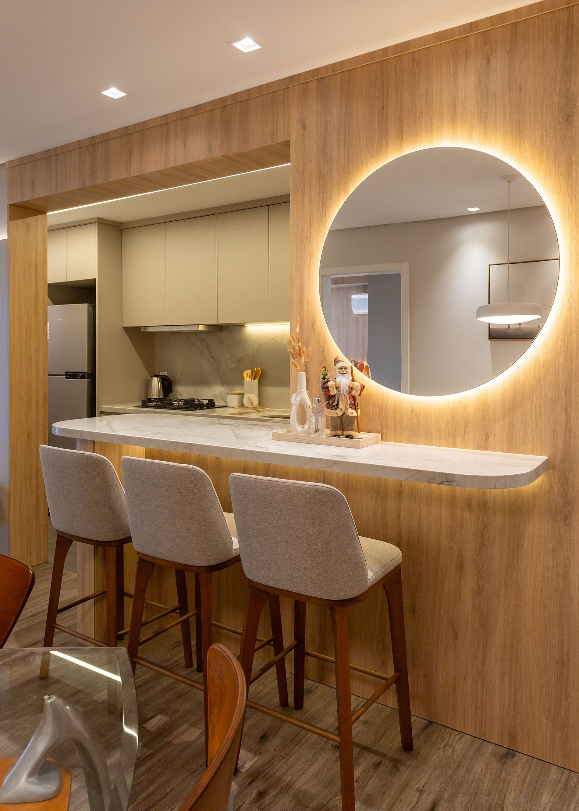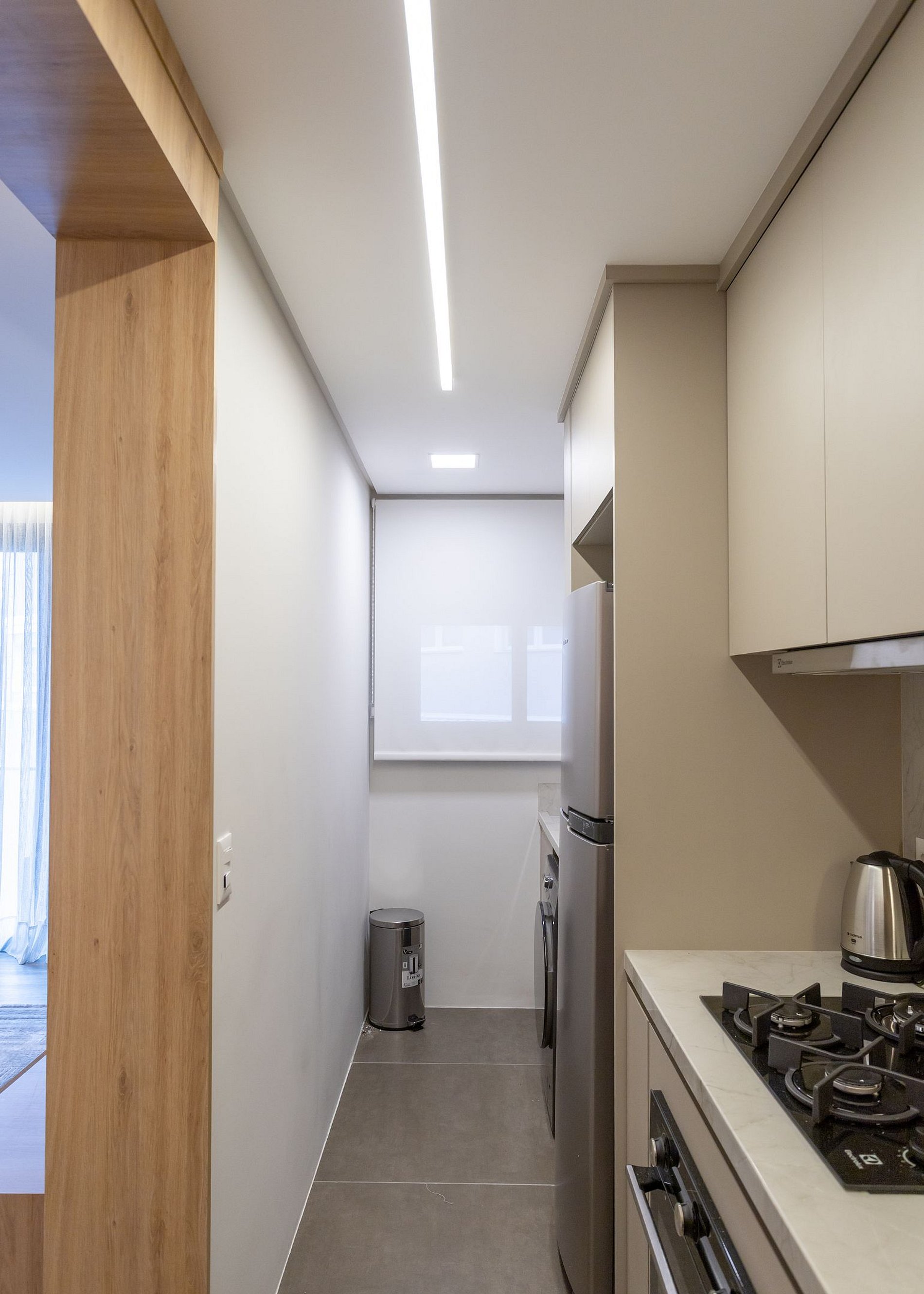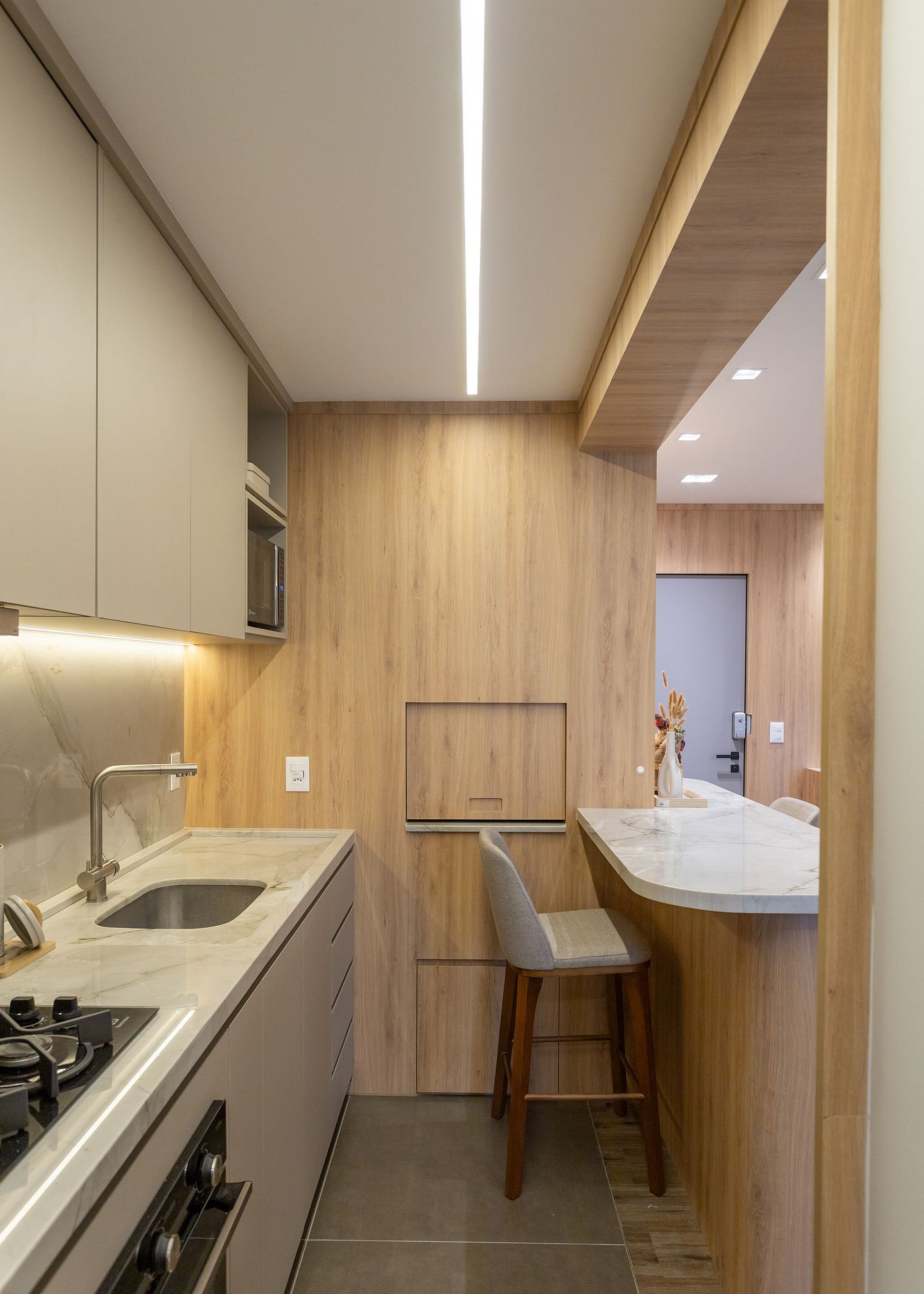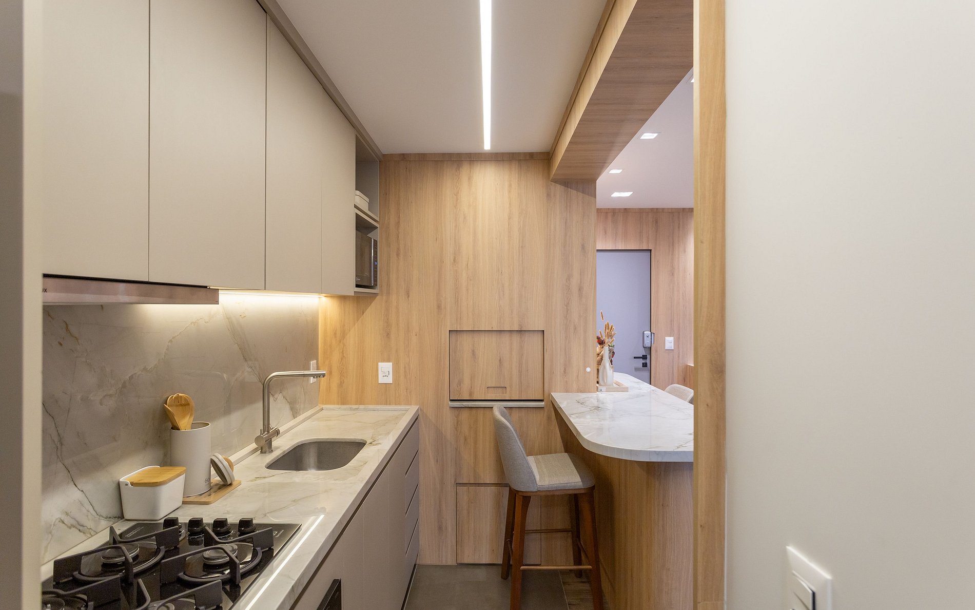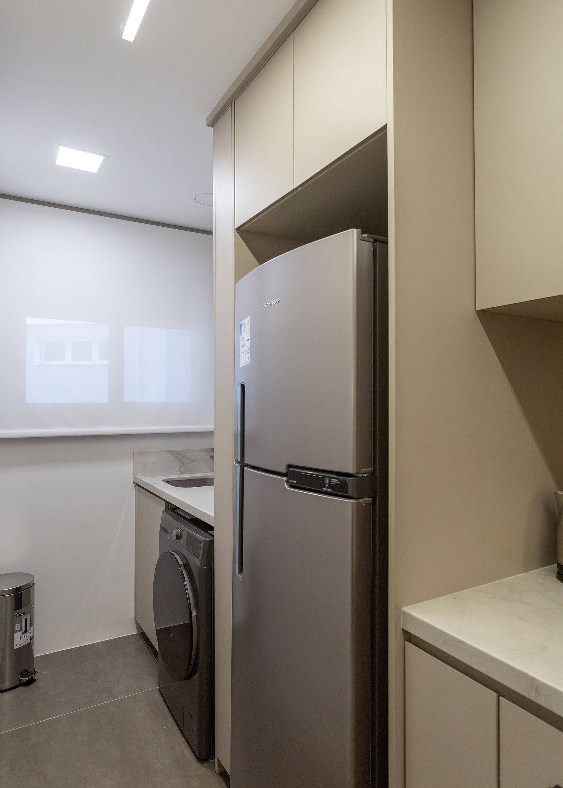 - Cozinha e área de serviço conjugadas com churrasqueira.