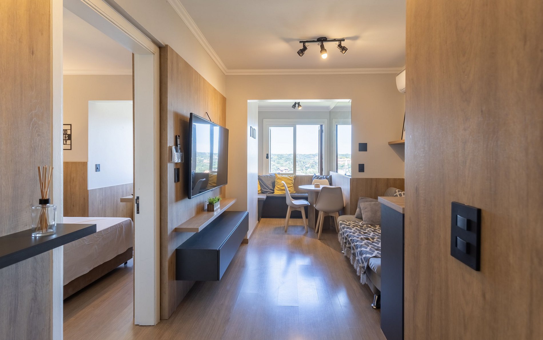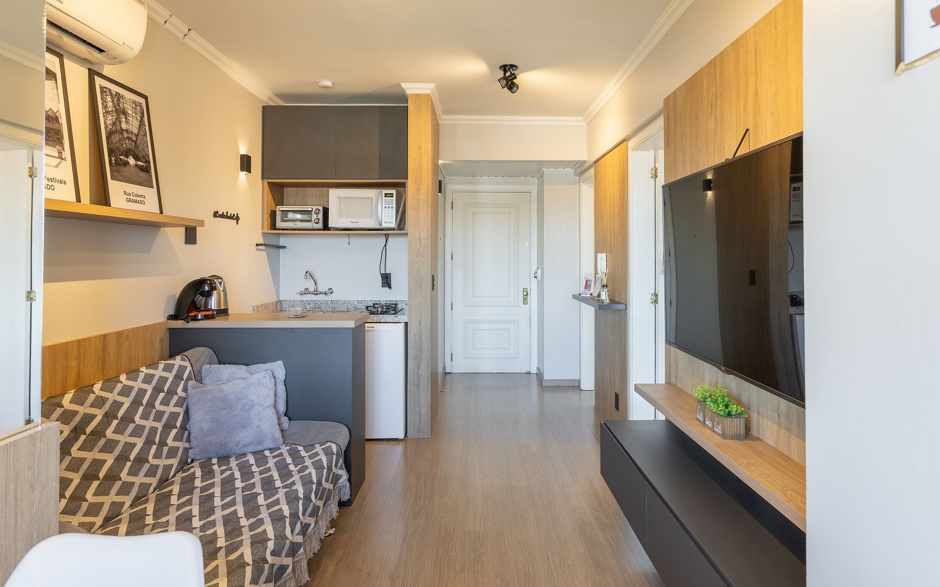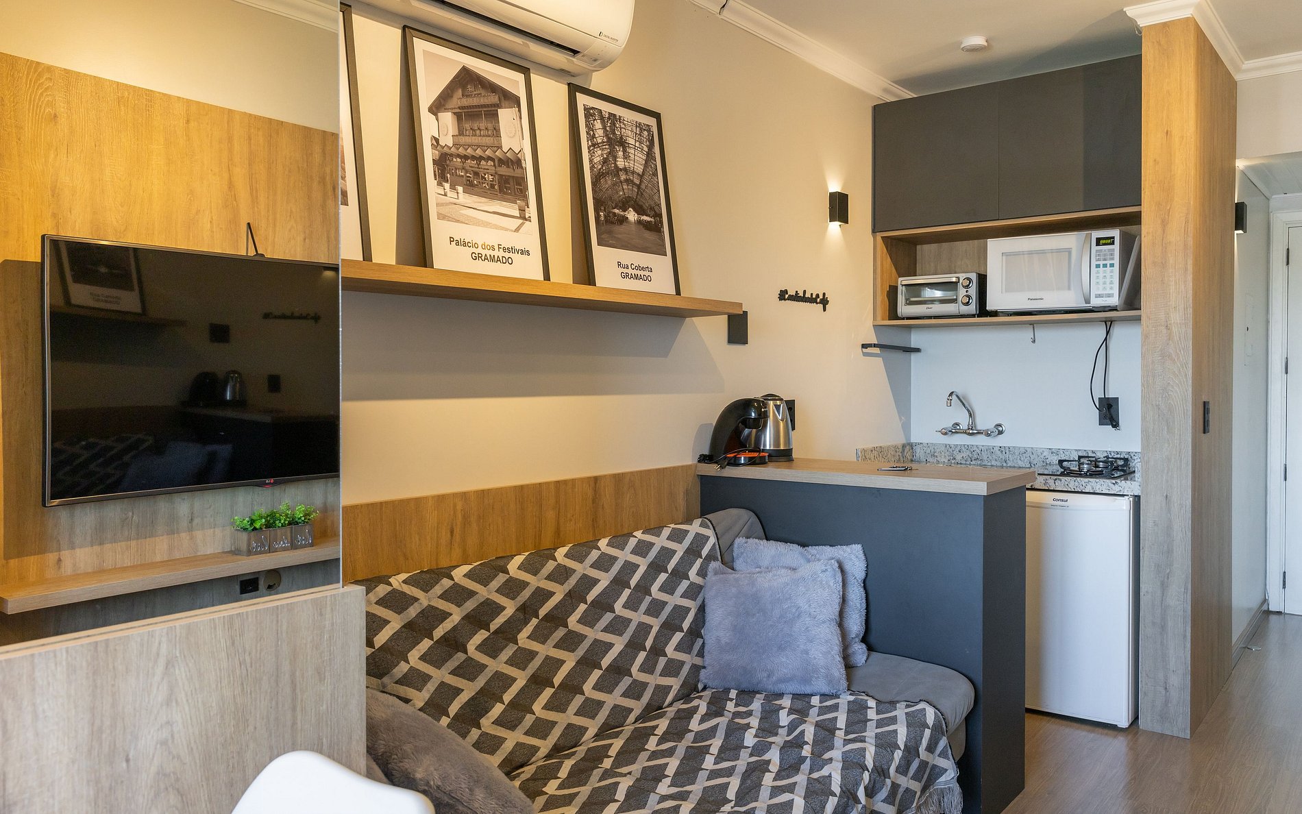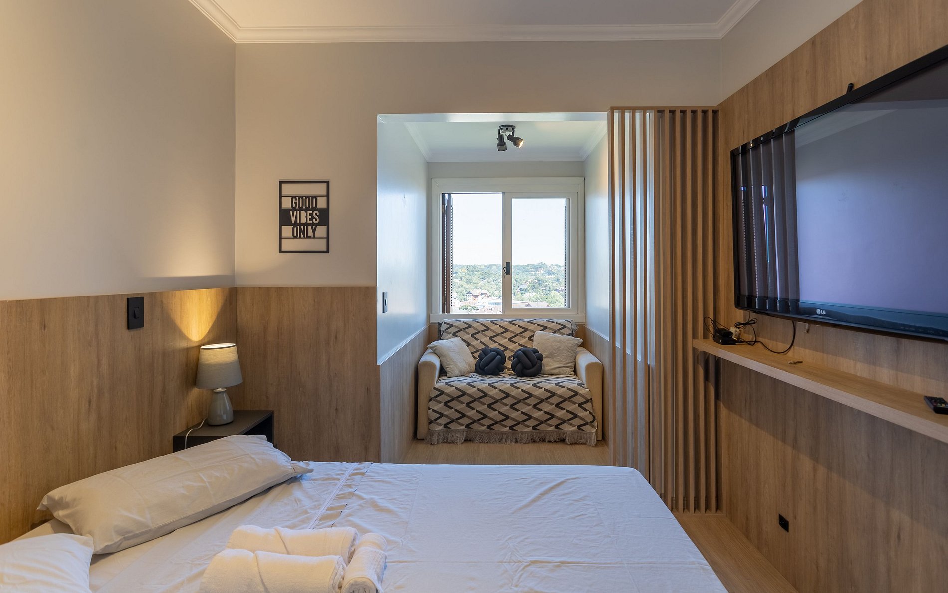 - 1 dormitório (1 cama de casal) + 1 sofá cama (acomoda 1 hóspede).