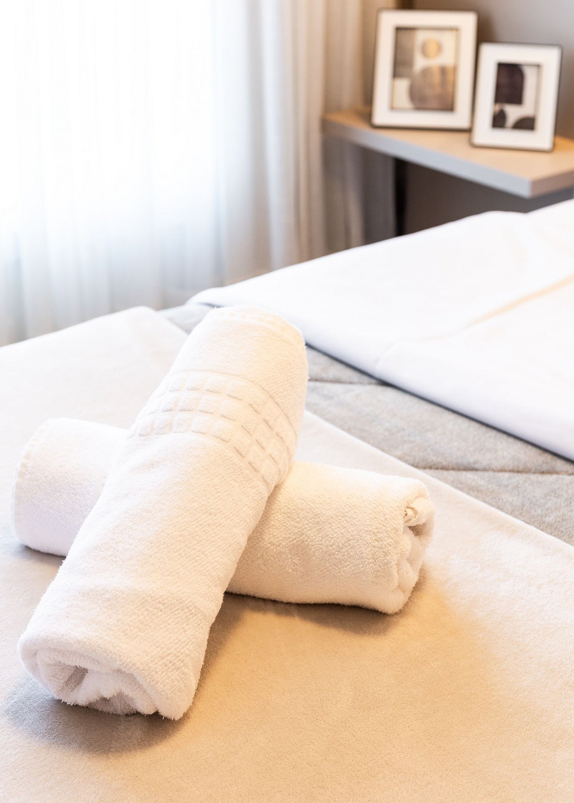 - 1 Toalha de banho por hóspede e toalha de rosto.