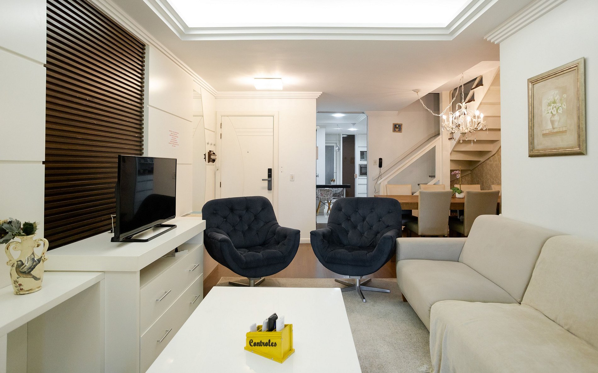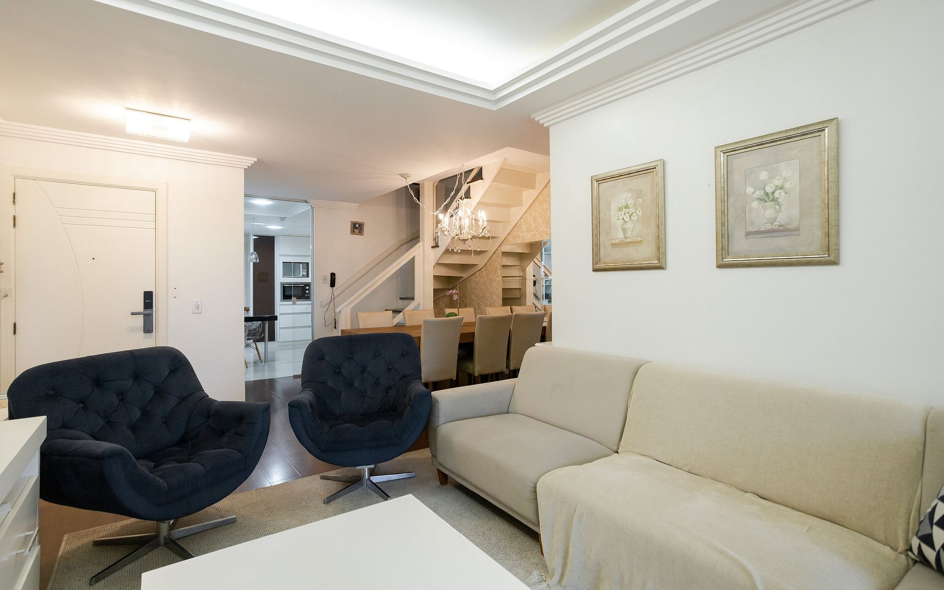 São incríveis 240m², muito amplo e espaçoso, o apartamento está totalmente equipado para receber e acomodar você da melhor forma. No primeiro piso possui sala de jantar e estar com lareira e ar condicionado, cozinha, lavanderia e 3 dormitórios.